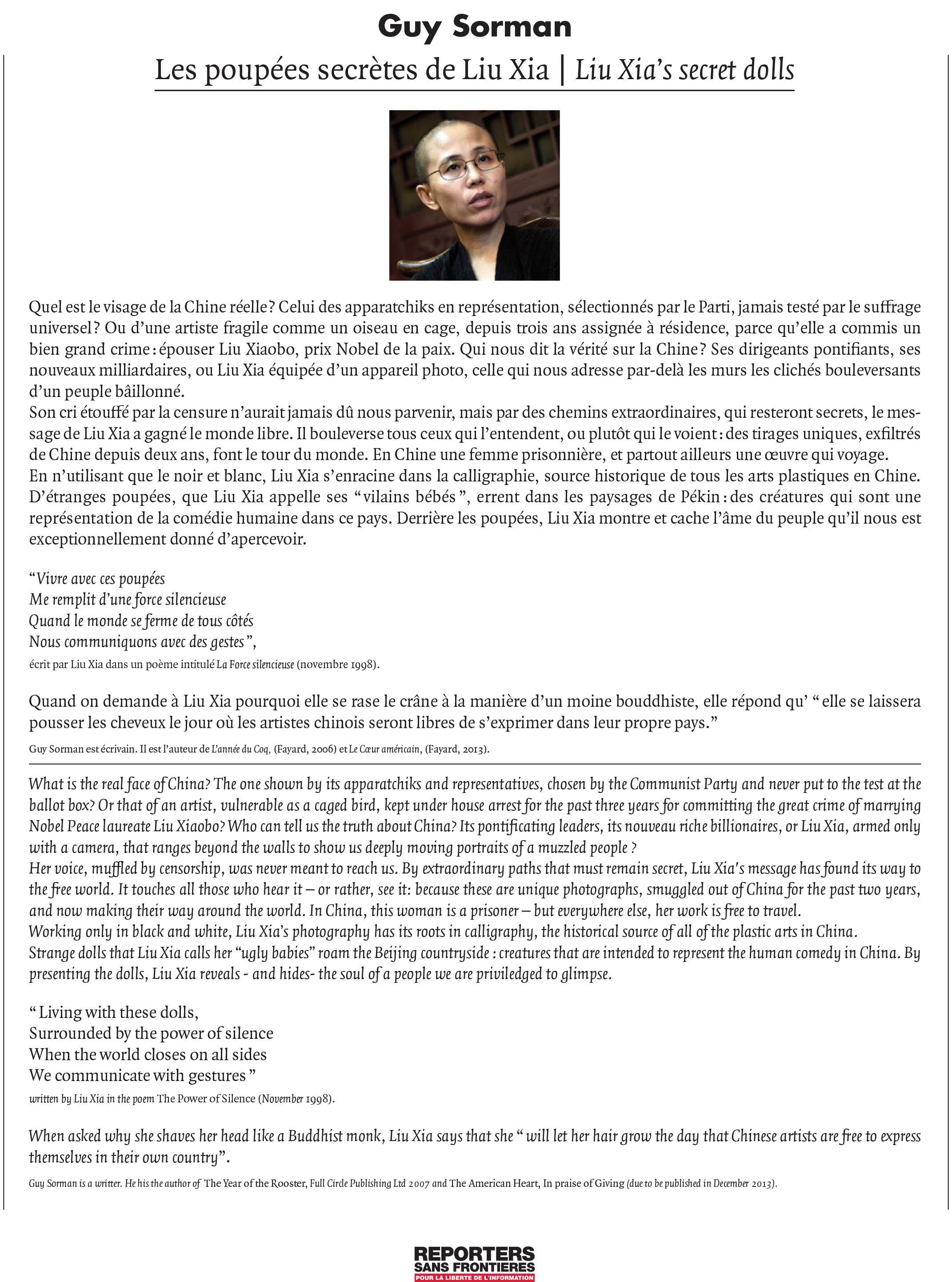 Reporters sans frontières publie les photos interdites de Liu Xia et Liu Xiaobo : « Les poupées secrètes de Liu Xia crient à la face du monde un autre visage de la Chine. Aux côtés des tirages inédits de cette artiste interdite d’exposition et assignée à résidence, un portrait inédit de son époux, Liu Xiaobo, Comme la balle au bord de la table, seul prix Nobel de la Paix au monde actuellement incarcéré, résonne comme un symbole de la lutte pour les droits de l’Homme en Chine. »