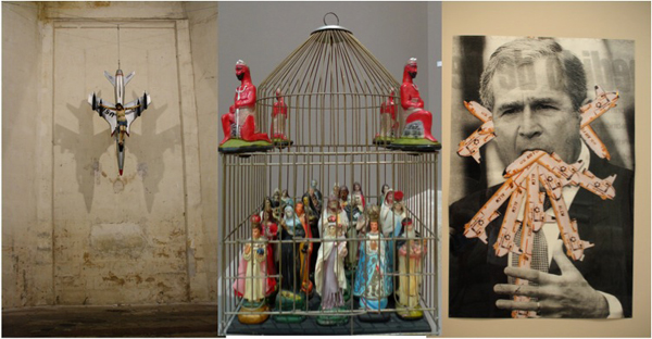 Des idoles même plus très subversives comme Léon Ferrari, invité d’honneur  pour sa première rétrospective en France (après le MoMa de New-York, place to be !). Au Chili sous Pinochet, il fallait avoir des couilles pour crucifier Jésus sur un avion largueur de bombes (La civilizacion occidental y cristiana, 1965). mais l’anticléricalisme radical de l’ironique artiste chilien, même présenté pour la première fois dans une église – comme s’en enorgueillit le commissaire Andrès Duprat – ne choque plus grand monde. Pire, l’oeuvre devient « ludique » pour les nouveaux adorateurs du dieux Conso. En short, une glace à la main, toutes ces poupées colorées et ces plans minutieux sont « tellement mignons » (en live, le 10 août vers 16h32). Un fatra de bondieuseries transformé en culte de l’objet de série, 100% plastic; « Mémé chérie avait le même sur sa cheminée » et aussitôt la machine à nostalgie s’enclenche benoitement. On aurait aimé voir ça à Lourdes.