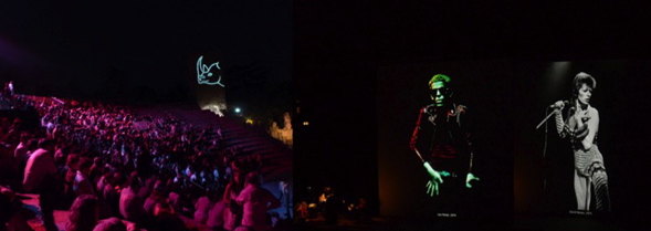 Pour que le petit peuple d’Arles, baigné « d’affection« , selon Jean-Noël Jeanneney, président des Rencontres, puisse applaudir ces idoles, le magnifique théâtre antique offre ses gradins. Diaporama sous les étoiles de Claude Gassian, accompagné en direct par le pianiste Pascal Comelade. Un excellent 10 juillet avec deux ricanements : 1/ alors que le Dieu Jagger est sacralisé à Arles, Claude Gassian raconte en voix off ses difficultés à rester maître de sa photo face à l’égo démesuré du modèle qui veut bien poser mais à sa guise; apparait alors une photo de Mick dans une chambre d’hôtel sous un chapeau et derrière une table, l’air de bouder au second plan, Jagger ronge son frein. Gassian gagnant. 2/ la huée spontanée à la vue de Carla Bruni. Pour un festival assuré de la « reconnaissance au plus haut niveau de l’Etat », selon son président, qui expose pour la première fois la collection de Marin Karmitz, producteur ami de Nicolas Sarkozy, c’est pas « care ».