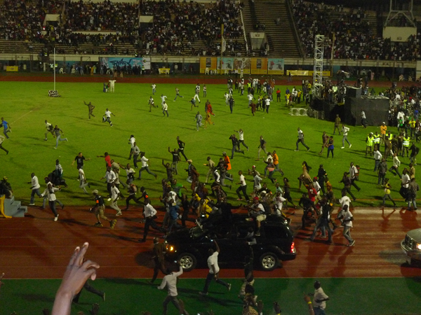 A peine quelques mesures et l’ex-taulard s’énerve : la pelouse est vide, à l’exception de quelques VIP et des militaires. Les forces de l’ordre sont omniprésentes (600 + 1000 vigiles privés). Le producteur Ernest Adjovi (aussi organisateur des Kora à Ouagadougou et réconcilié avec Akon depuis un ancien lapin) a tout verrouillé. Les spectateurs à 5.000 francs CFA (7,5 euros), 10.000 ou 25.000 sont parqués dans les tribunes. Le chanteur exige qu’on les laisse descendre. Enième interruption…Tout le monde hésite, les matraques tournoient. Quelques téméraires s’élancent mais le coeur n’y est plus. Tant pis, on le verra de loin.